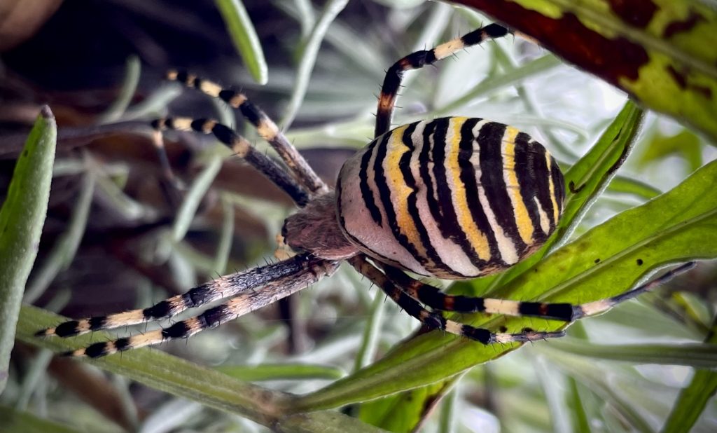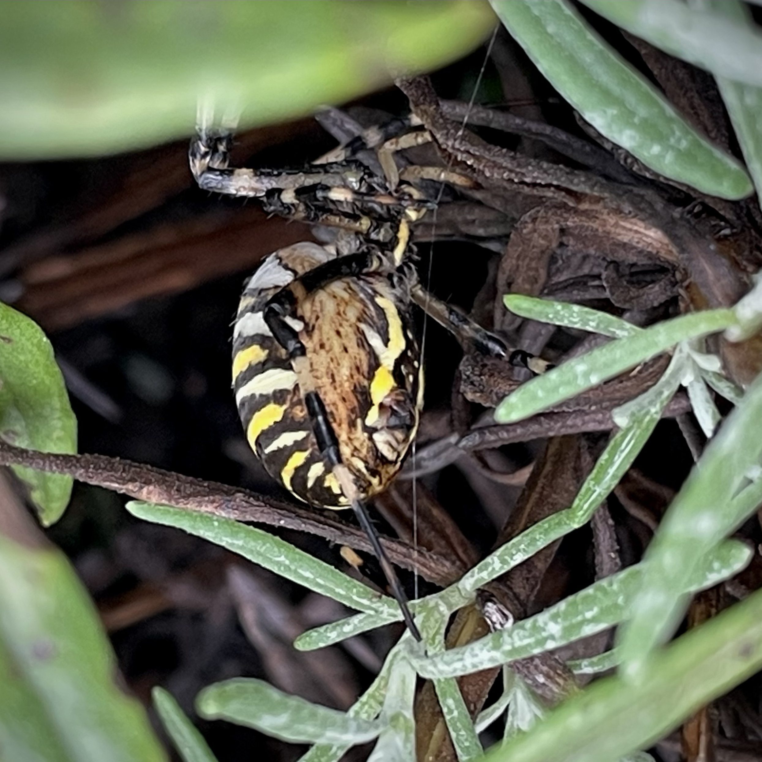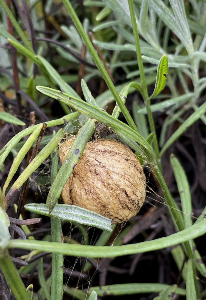 » En coupant mes lavandes, que vois-je : un nid qui me semblait bien celui d’une araignée. Effectivement elle était là, juste à côté essayant de protéger sa progéniture. ARGIOPE FRELON : Elle aime le soleil, se fait donc rare dans  le Nord, elle s’installe particulièrement dans la lavande. Elle se nourrit principalement de sauterelles, mouches et abeilles (elle a de quoi faire dans mes lavandes!) Son abdomen  est striée de noir et de jaune, on pourrait croire que c’est pour effrayer ses prédateurs, mais, en réalité     cette couleur doublerait le nombre de ses captures d’insectes.  Cette spectaculaire araignée est inoffensive…  » Cathy