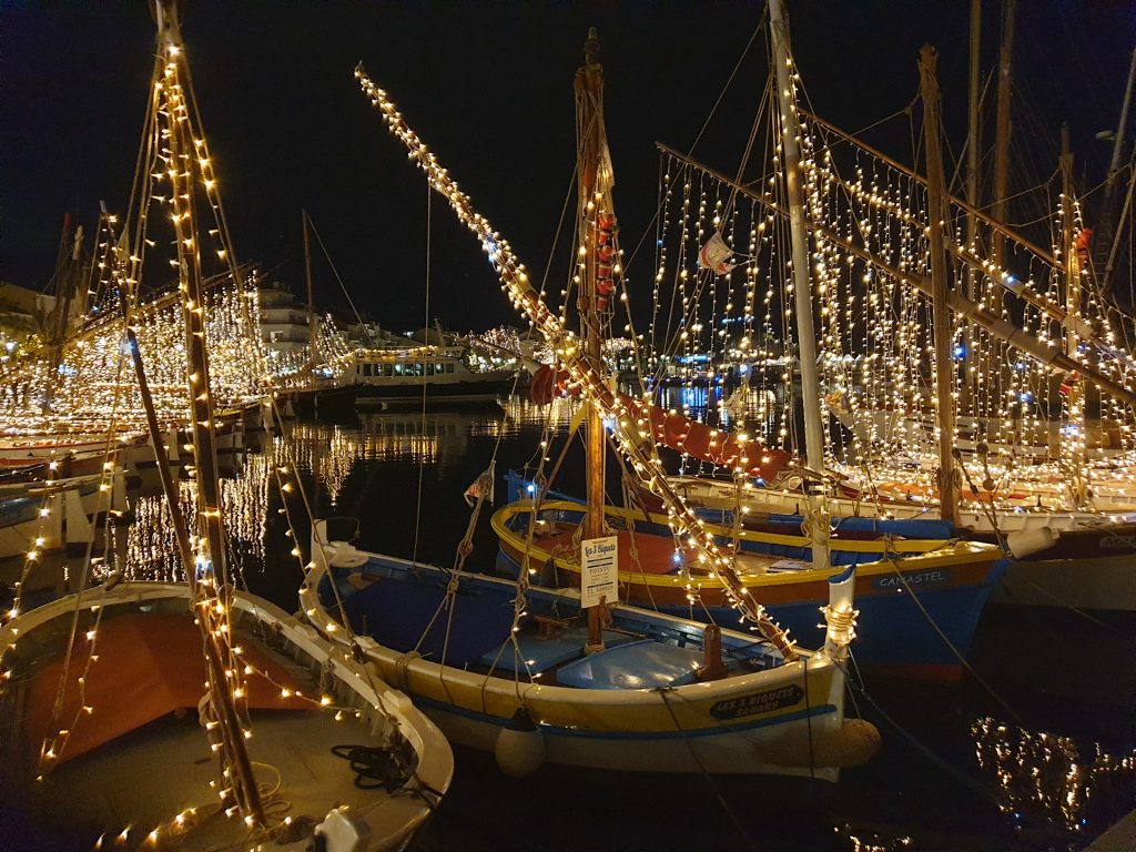 Dans les petits ports du bord de la méditerranée on pavoise sur les bateaux avec des guirlandes lumineuses pour les fêtes de Noël et du Jour de l’an. L’effet est des plus agréable pour nos yeux de touristes de fin d’année. Merci Martine pour ces jolies photographies du port de Sanary.