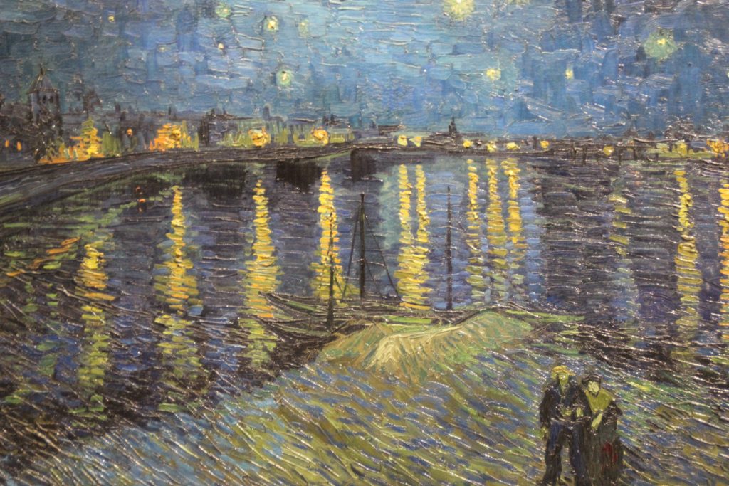 Nuit étoilée… Arles, sur le bord du Rhône. Vincent Van Gogh a peint plusieurs toiles intitulées « nuit étoilée »… la plus célèbre étant celle du grand cyprès… c’était la vue qu’il voyait de sa chambre quand il a séjourné en hôpital psychiatrique à Saint Rémi de Provence. Après une violente crise ( on dit qu’il était bipolaire ou épileptique) où il se coupe le lobe de l’oreille, il se fait volontairement interner à Saint Paul de Mausole, un haut lieu de soins pour la santé mentale à l’époque.